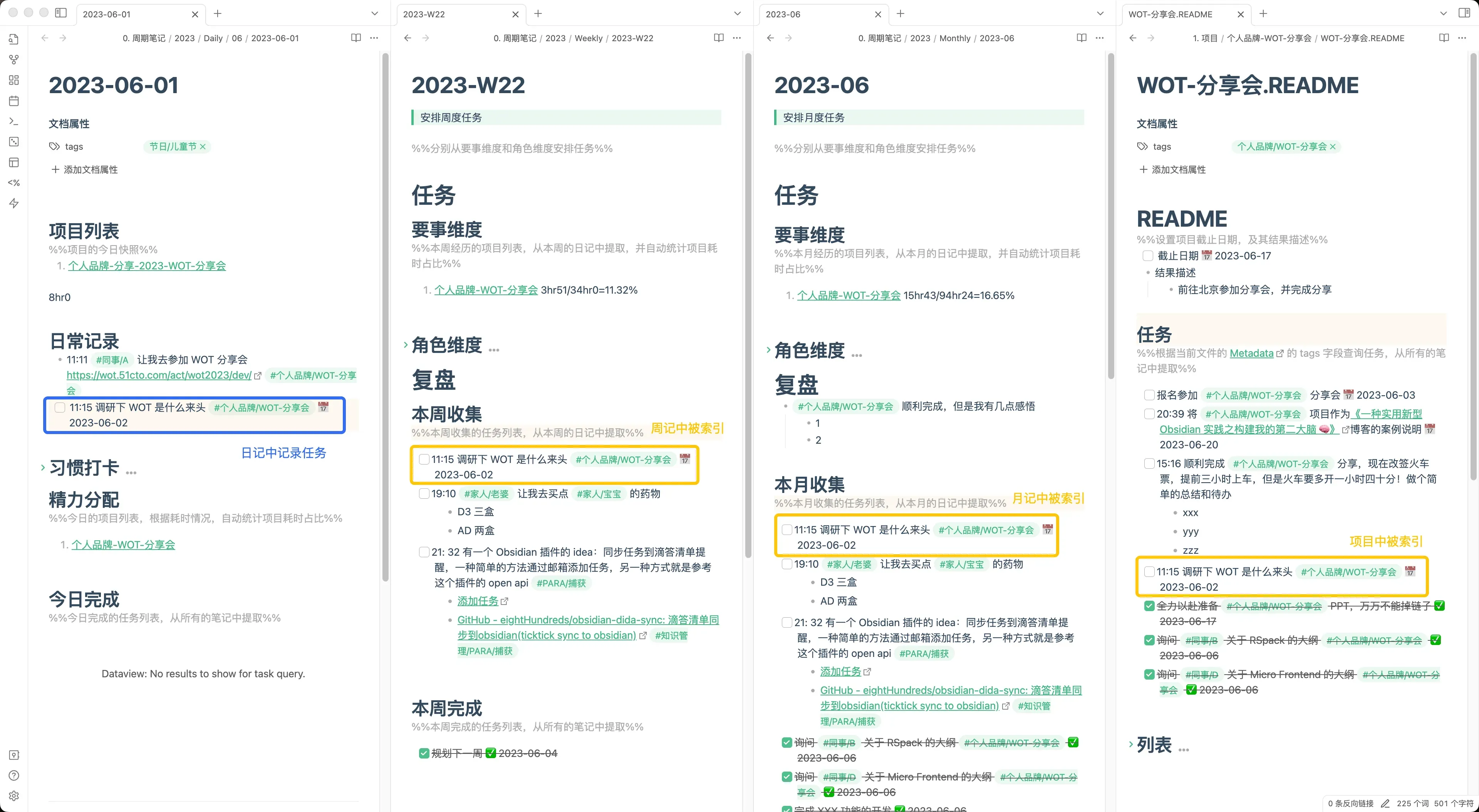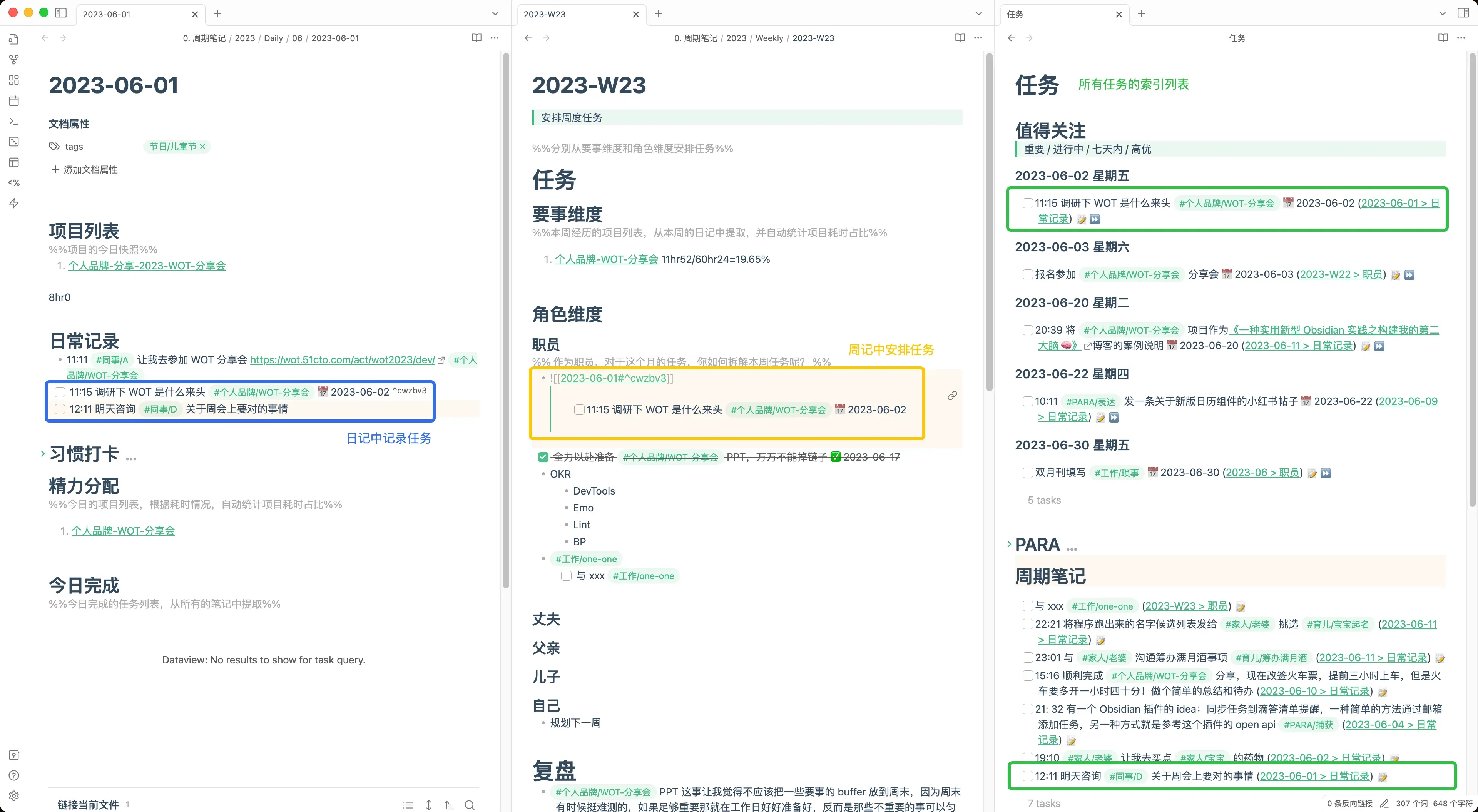 为什么可以不用在意在哪里收集的呢?因为你可以在多个地方重新回顾这个任务,比如根目录的任务索引、周记、月记、季记、年记中的任务收集模块、PARA笔记的 *.README.md 索引文件