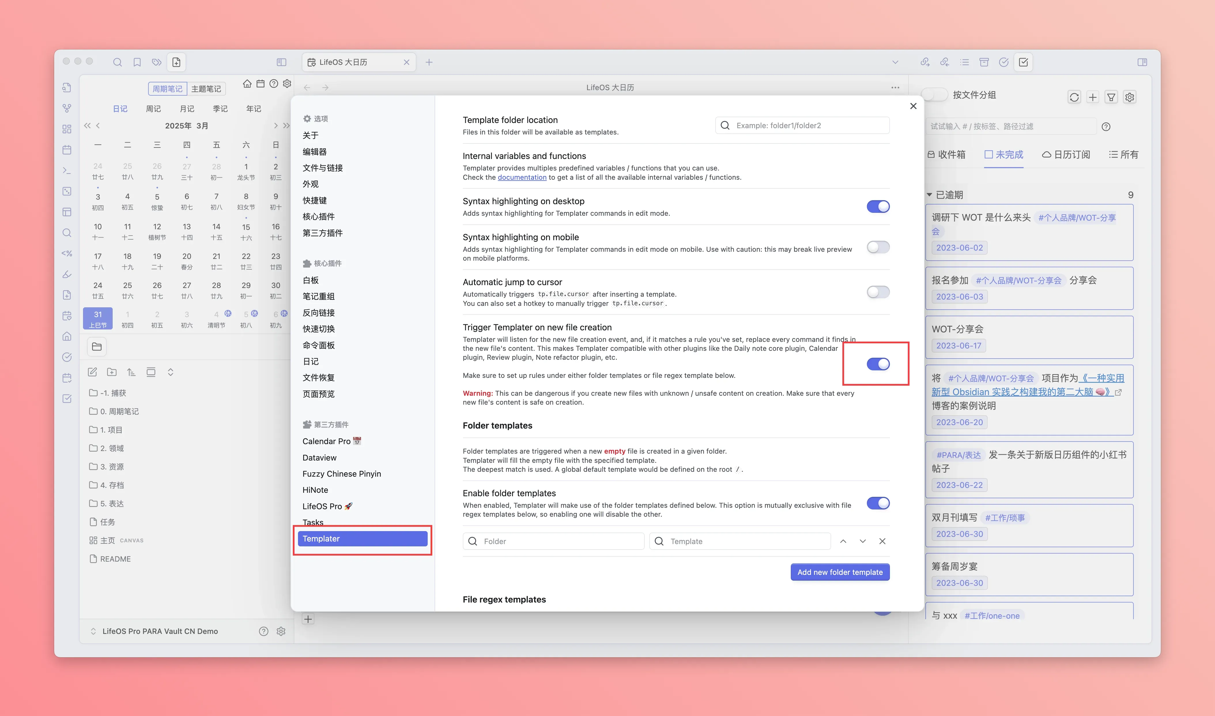参考下图,配置你的周期笔记的模板文件,每次创建周期笔记都会调用对应的模板新建